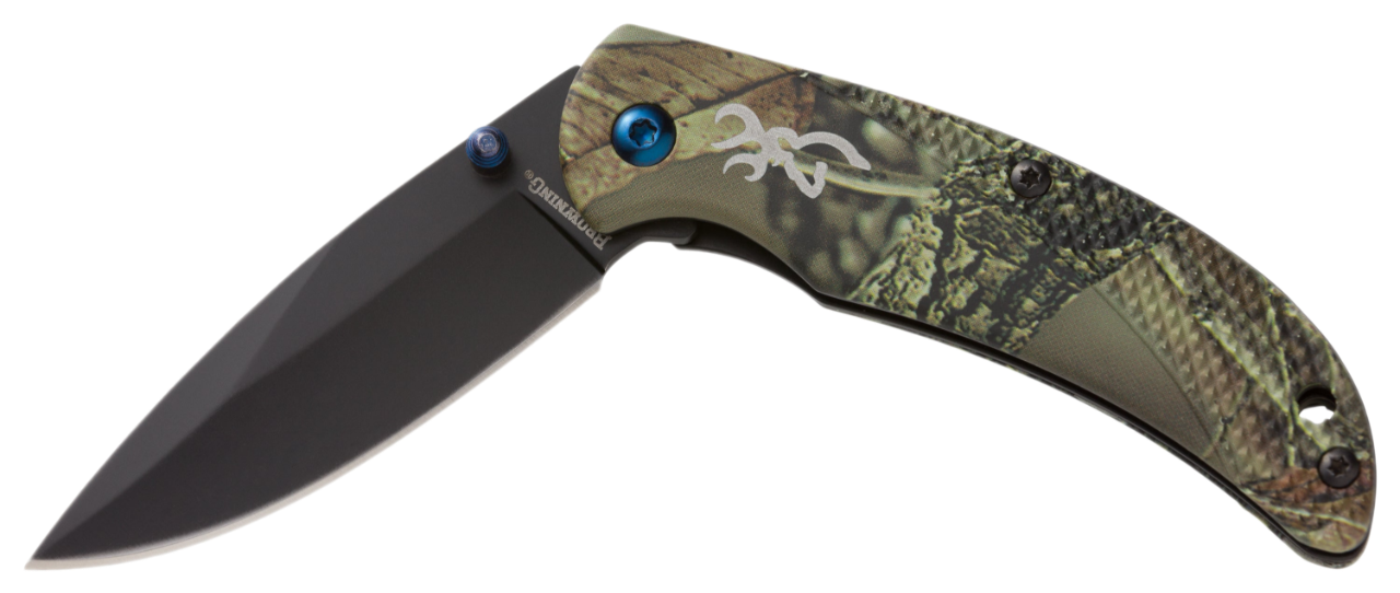 The Browning Prism 3 Camo is a small folding knife with stainless steel drop point blade, aluminum handle scales with a camo anodized finish.