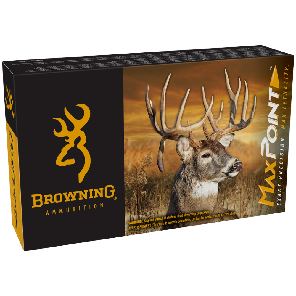 Browning® Max Point Rifle ammunition is designed specifically for hunting medium-sized game, including whitetail deer, mule deer, and pronghorn. Max Point bullets are meticulously manufactured, designed to quickly transfer expansion energy for maximum lethality to game, and to ensure critical shot placement is made with exact precision.