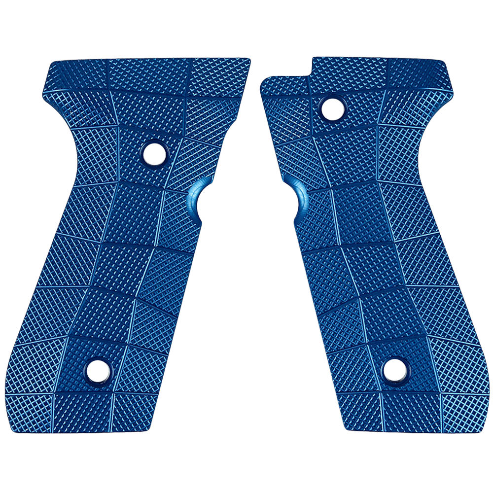 These Beretta 92 thin grips are CNC machined from solid 6061 Aluminum, anodized in a striking blue, and feature the aggressive GridLOK texture for increased performance and stability.