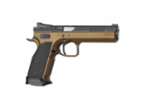 A masterpiece of the sports special for competing in the IPSC Standard Division. This hand-fitted and matched model features a frame with a Bronze Cerakote finish and a polished barrel. Its flat polymer grips and magazine base are black anodized. The pistol comes standard with a pin instead of a slide stop and is equipped with an adjustable metal sight, adjustable left thumb rest, adjustable, black anodized magazine release and an extended manual lock safety on the left side (flat on the right side).