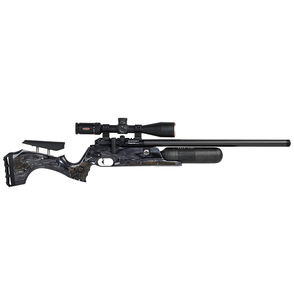 The Black Wolf .22 Grey Laminate is a precision-built PCP air rifle designed for accuracy and consistency. Featuring a 480cc cylinder and 28" barrel, it delivers reliable shot performance with a striking grey laminate tactical stock. Perfect for target shooting and field use, it blends style, comfort, and performance.
