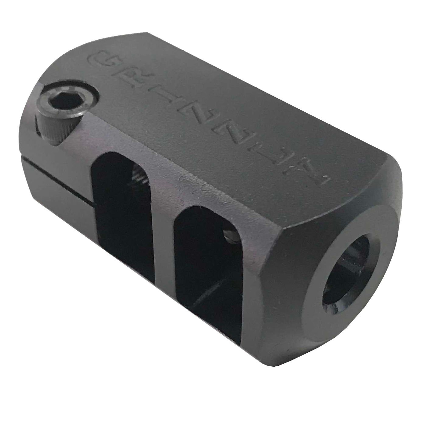 Designed for calibres up to .338cal. These brakes are an easy, convenient screw on design that do not require any crush washers or special tools. Just screw the muzzle brake on all the way past the shoulder, align it square on the barrel and then tighten the small allen key bolt on the side of the brake. This compact brake will accommodate every barrel size up to 18mm with or without a M14x1 thread.