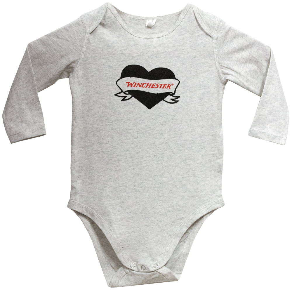 Winchester baby bodysuit with long sleeves. Features press-stud buttons at crotch, 100% cotton.