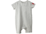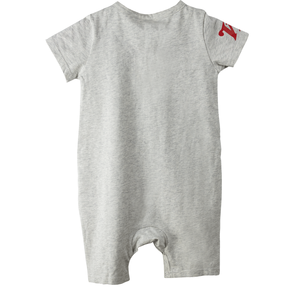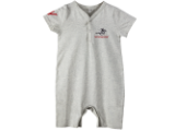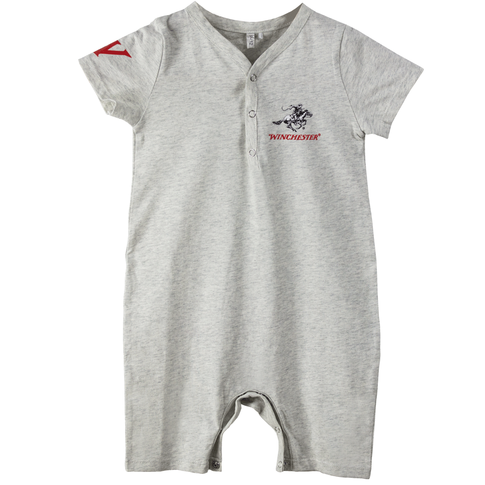 Winchester baby bodysuit with short sleeves and shorts at legs. Features press-stud buttons at crotch, 100% cotton.