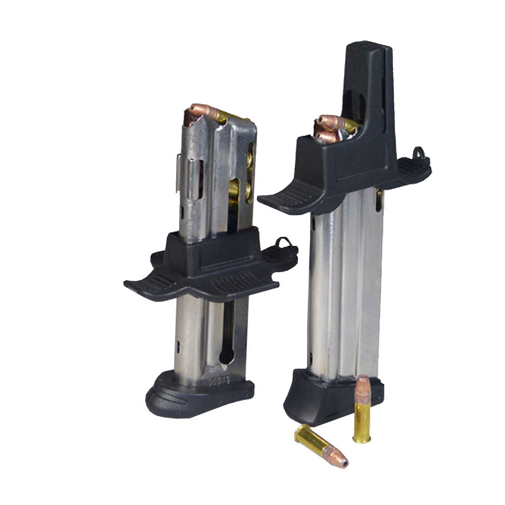 A set of two loaders for loading .22LR cal. single-stack narrow mags with a projecting side-button.
